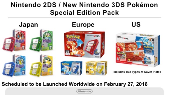 On the same date, three types of special edition Nintendo 2DS systems with Pokémon Red Version/Blue Version/Yellow Version preinstalled will be launched in Europe, and a special edition New Nintendo 3DS system with Pokémon Red Version/Blue Version preinstalled which also comes with two types of cover plates will be launched in the US.