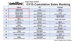 Super Smash Bros. series characters, including third-party characters, are popular in the US, and in Europe, a wide range of amiibo from iconic characters to brand new characters sell well. On the other hand, the Splatoon series dominates the top three in Japan.