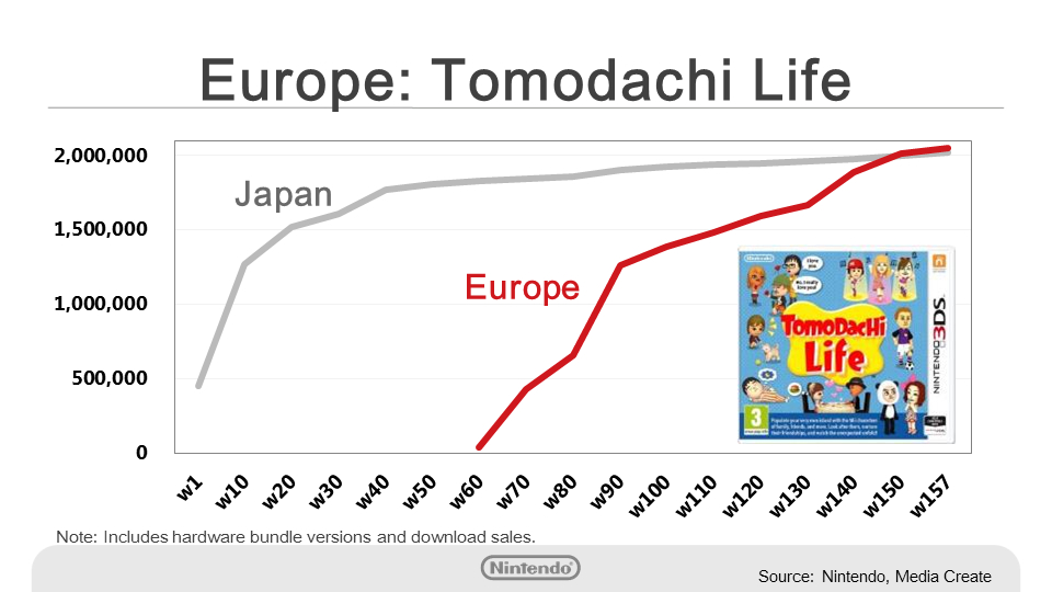 Tomodachi Life has been a major title that recently surpassed two million sales in Japan. In the European market, this title was localized into various languages, and was launched in June 2014.