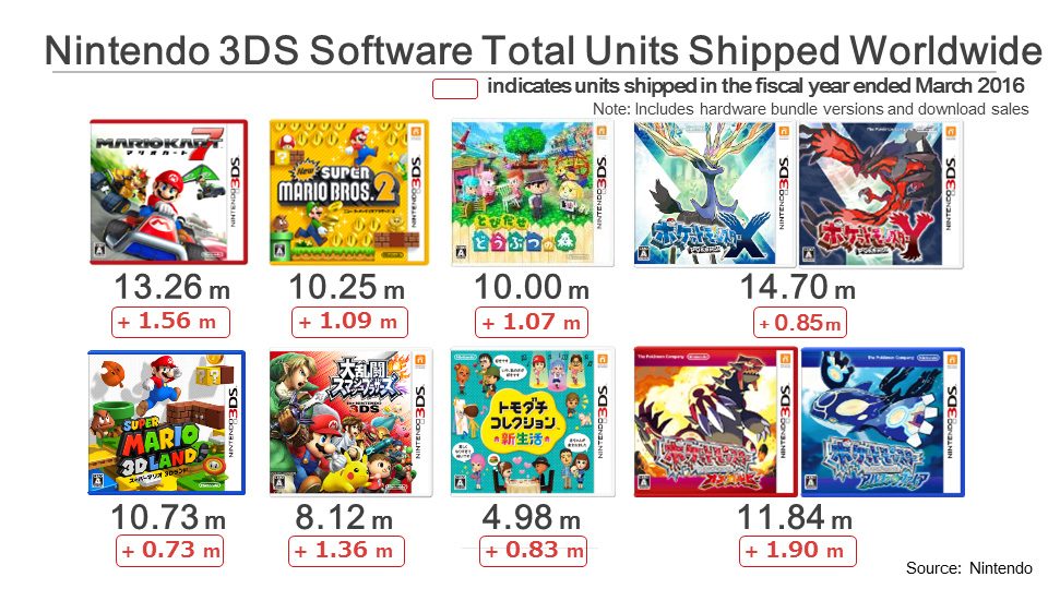 This slide shows the major Nintendo 3DS titles and the total units shipped worldwide. The amounts shipped over the fiscal year ended March 2016 are indicated in the red boxes.