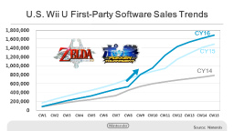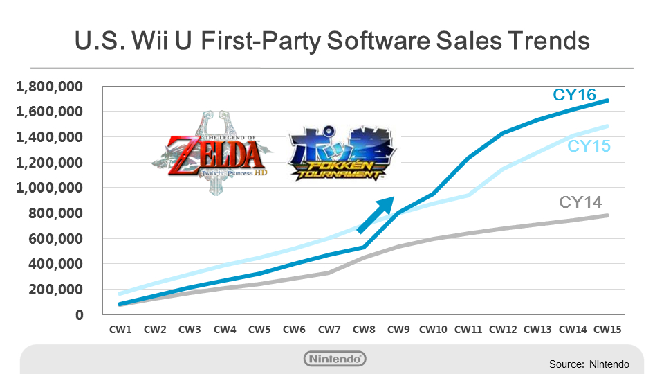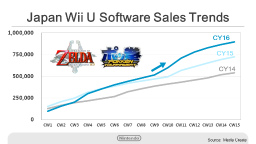 This graph shows the Wii U software sell-through in Japan from the start of the year through last week, compared with the same period over the last two years. Splatoon has continued to sell well since the start of the calendar year, and we launched The Legend of Zelda: Twilight Princess HD on March 10th and Pokkén Tournament on March 18th, spurring higher sales in this period than in the same period in the last two years.