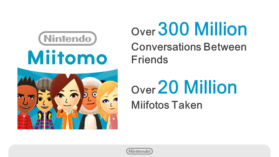 On top of the number of the unique users, the number of conversations exchanged within Miitomo has exceeded 300 million. In addition, the "Miifoto" functionality allows users to create unique pictures with their Mii, and users have already created more than 20 million of these pictures.