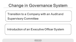 Now I would like to explain about the changes in Nintendo's corporate governance system as resolved in the meeting of the Board of Directors held yesterday. We resolved to transition to a system with an audit and supervisory committee, and to introduce an executive officer system.