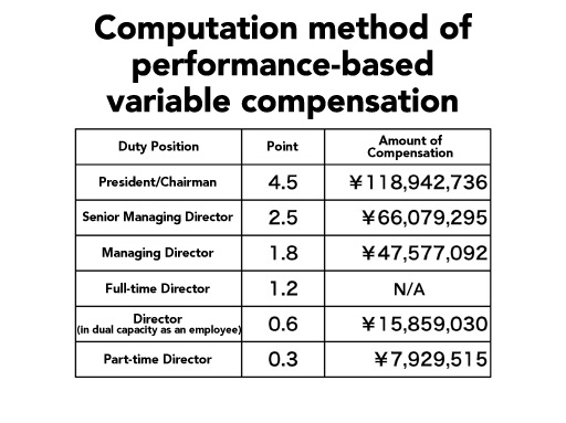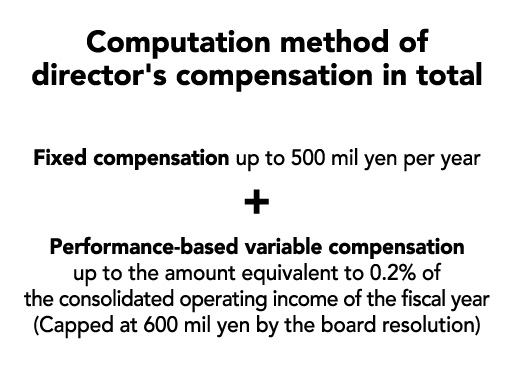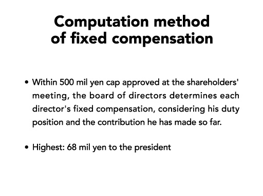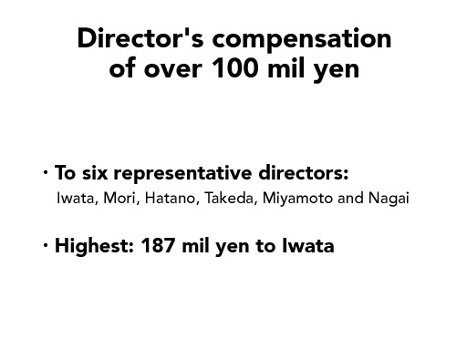 Satoru Iwata (President, Chairperson of the shareholders' meeting): Regarding the compensation to directors and auditors, it was only necessary for the Japanese listed companies to disclose the total amount paid. Starting from this fiscal year (ended March 31, 2010), companies are required to disclose the names of its directors and auditors with the annual compensation of 100 million yen or more in the annual securities report. For Nintendo, six representative directors will be listed on the 70th annual securities report: Mr. Iwata, Mr. Mori, Mr. Hatano, Mr. Takeda, Mr. Miyamoto and Mr. Nagai, and I, Satoru Iwata, was the highest paid, receiving 187 million yen. Although I have already answered this question from a shareholder, let me supplement how this was determined for reference. Three years ago, in the 67th Annual General Meeting of Shareholders, it was approved that compensation payable to directors consists of fixed compensation and performance-based variable compensation: fixed compensation of up to 500 million yen per year and performance-based variable compensation of up to the amount equivalent to 0.2% of the consolidated operating income of the fiscal year. Fixed compensation to each director, which is determined by the board of directors, basically reflects his duty position and the contribution he has made so far. The total amount of the fixed compensation for the 70th fiscal year was 415 million yen. The highest fixed compensation of all directors is 68 million yen per year to the president. The fixed compensation is divided into 12 equal parts and paid monthly to each director. As for the variable compensation, as I just explained, it is performance-based and the maximum amount is up to 0.2% of the consolidated operating income. The board of directors also voluntarily decided that the performance-based variable compensation should be rounded down to the nearest 10 million yen and capped at 600 million yen. The rounded-down amount, which is equivalent to 0.2% of the consolidated operating income of the 70th fiscal year (356.5 billion yen), was 710 million yen, which exceeds this voluntary ceiling. The total performance-based variable compensation for the 70th fiscal year, therefore, resulted in 600 million yen. Our annual securities reports have shown specifically how the determined performance-based variable compensation is allocated to each director, but please let me explain about this in detail. Each duty position is assigned points based on its responsibility. The determined performance-based variable compensation is allocated according to the points. The point total for all of 12 directors was 22.7 for the 70th fiscal year and, for example, the president received 4.5 points. Therefore, I, as the president, am entitled to 4.5/22.7 of the total amount of the performance-based variable compensation. This slide shows the allocation of a total of 600 million yen to each duty position. Please note that small adjustments were made in order to avoid showing the fractions. Directors receive the calculated amount of performance-based variable compensation as an executive bonus after the conclusion of each year's Annual General Meeting of Shareholders. The six representative directors receive compensation of 100 million yen or more by means of the above-mentioned formula. Let me also add that Nintendo abolished the retirement benefit system for directors and auditors at the 65th annual general meeting of shareholders, and does not have non-cash compensation such as stock options for directors and auditors. |