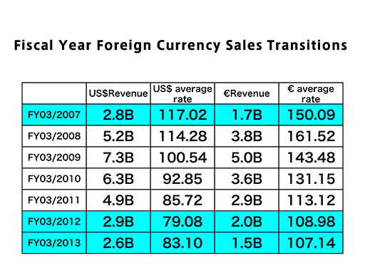 Iwata: Your question was why Nintendo suffered operating losses in its 72nd and 73rd fiscal terms, despite the fact that Nintendo was able to earn enough profits in the past with the same level of sales. Regarding this question, there is one aspect that is very easy to understand. This table shows changes in sales in foreign currencies. Please look at the top colored row (the fiscal year ended March 31, 2007) and the bottom two rows showing the latest two periods with operating losses (the fiscal years ended March 31, 2012 and 2013). The second column from the left shows U.S. dollar-denominated sales and “2.8B” means 2.8 billion dollars. The figures in the bottom two rows (for the most recent two fiscal years) are 2.9 and 2.6 billion dollars respectively. Then I would like you to compare the exchange rate of the top row with that of the lowest ones. Yen-denominated sales are calculated by multiplying these sales figures such as 2.8 and 2.9 billion dollars by these exchange rates. Therefore, you will understand even if the scale of our businesse in the United States is the same, the yen-denominated sales shrink because of the appreciation of the yen against the dollar. Nintendo mainly carries out development in Japan, so almost all development costs are incurred here. Nintendo purchases component parts in dollars as much as possible in order to enjoy the benefits of a weak dollar. However, appreciation of the yen against the dollar generally negatively affects Nintendo’s financial results. Euro-denominated sales figures on the right are 1.7 billion euros for the fiscal year ended March 31, 2007, 2.0 billion euros for the fiscal year ended March 31, 2012 and 1.5 billion euros for the fiscal year ended March 31, 2013. With respect to the rightmost exchange rates of the euro, the business environment in recent years was totally different from that in the fiscal year ended March 31, 2007 when the exchange rate was 150 yen per euro. I would like you to understand that the influence of exchange rates is the main aspect of this matter. Regarding U.S. dollars, as I mentioned earlier on, the influence can be offset to some degree with dollar-based purchases. Concerning the euro, on the other hand, even though we have attempted to increase the number of partners who receive payments in euros, the number is still very low. One more difference from that time is Nintendo’s head-count. The manpower required for increasingly complex and advanced product development has totally changed from that of the past. Hence, the number of employees has increased and higher costs have been incurred. In addition, due to development of more elaborate software titles than before, for example, costs associated with localizing titles in English or other languages have risen. Regarding why we have not reduced the number of the personnel, it is true that our business has its ups and downs every few years, and of course, our ideal situation is to make a profit even in the low periods, return these profits to investors and maintain a high share price. I believe we should continue working toward this ideal. If we reduce the number of employees for better short-term financial results, however, employee morale will decrease, and I sincerely doubt employees who fear that they may be laid off will be able to develop software titles that could impress people around the world. I believe we can become profitable with the current business structure in consideration of exchange rate trends and popularization of our platforms in the future. We should of course cut unnecessary costs and pursue efficient business operations. I also know that some employers publicize their restructuring plan to improve their financial performance by letting a number of their employees go, but at Nintendo, employees make valuable contributions in their respective fields, so I believe that laying off a group of employees will not help to strengthen Nintendo’s business in the long run. Our current policy is to achieve favorable results by continuously cutting unnecessary expenses and increasing business efficiency. Thank you for listening. |