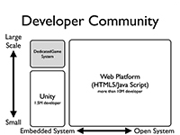 Iwata: I have just described “Nintendo Web Framework,” but I guess my explanation might have been a little too simple. We have publicly set forth the goal of “gaming population expansion” or “user population expansion,” but when it comes to the Nintendo Web Framework project, we are calling it internally at Nintendo “developer population expansion.” Development of games for dedicated game systems has gradually become possible only for large-scale development teams. The best situation for a game platform is one where even a game developed over a short period by a small team could become very popular around the world. Many developers dream about competing to make a game for such a platform. However, recent video game machines are, in a sense, becoming rather unique systems because they require the software creators to use development methods specific to each game system, employ a large development staff and spend a considerable amount of time in order to develop a packaged software title for which consumers are willing to spend several thousand yen. This is a conceptual diagram of developer communities. The vertical axis shows the scale of a community. On the horizontal axis, “Embedded System” on the left is a system required for a dedicated development approach and “Open System” on the right is a system widely used in the world. When you access an active website, a special program to control actions has been automatically downloaded from a server and executed. This is an example of the technologies called “Web Platform.” This diagram also has information on the population of developers for each system. Currently, the top-left “Dedicated Game System” has a relatively small number of large-scale development teams left. As dedicated game systems require a unique software development method, developers have to learn a lot to understand such a method and then make considerable efforts to create game programs for such systems. The entry levels are going up because developers need to know a lot of things before starting developing games for Nintendo 3DS or Wii U for the first time. The bottom-left “Unity” is a video game engine with a vast number of developers around the world, which can easily be used to develop games for various platforms. We have started working to expand the developing population by organizing a partnership with Unity and making this engine available to Wii U developers. “Nintendo Web Framework” that you asked about is a system we have prepared so that the more than ten million developers of the right-sided “Web Platform” can relatively easily develop games for Wii U. However, since we are currently not capable of dealing with a vast number of individual developers, we cannot go so far as to widely open development opportunities to them tomorrow. However, we are accepting ideas from any corporations which are interested in it regardless of their scale or development experience and are considering the possibility of accepting individual developers in the future. This is the first step to increase the number of developers for dedicated game systems, which we started more than two years ago and announced this March. We hope that this will expand the potential of video games. Thank you for your understanding of our strategy. |