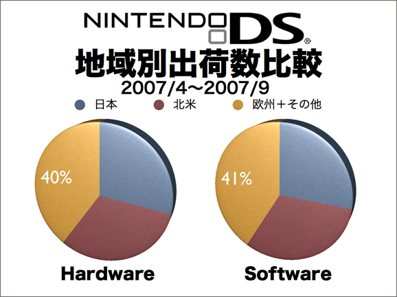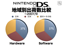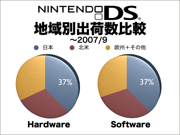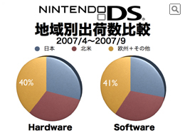 これは、今年9月末時点でのDSの地域別販売比率です。ご覧のように、全く異なる販売比率となっています。3地域の中で最も人口の少ない日本の市場が最大の市場となっており、アメリカ市場の存在感が世界で最も小さいという、これまでの当社の歴史になかった販売比率になっています。これは、ご存じの通り、日本で最も早くDSによるゲーム人口拡大の手応えが得られ、 DSの普及が最も早く進んだことによるものです。