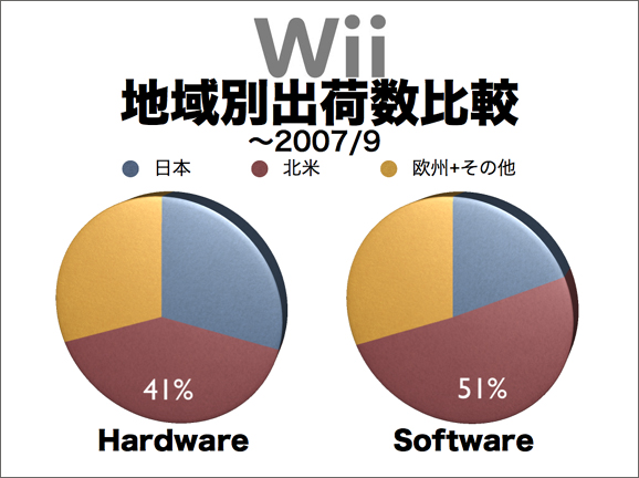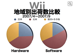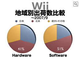 今上半期のみの出荷数を見ると、アメリカはもちろんですが、ヨーロッパの存在感が大きくなっています。これは、特に、今年の春以降、ヨーロッパ最大の市場であるイギリスにてWiiの販売が大きく伸びていることが影響しています。日本では、Wiiは毎週のように品切れになってしまうという状況から、この夏以降店頭でお買い求めいただきやすい状況になってきましたが、アメリカやイギリスでは、未だに毎週入荷した商品が、すぐに売り切れになってしまう状況が続いていると現地の関係者から報告を受けています。