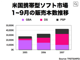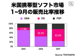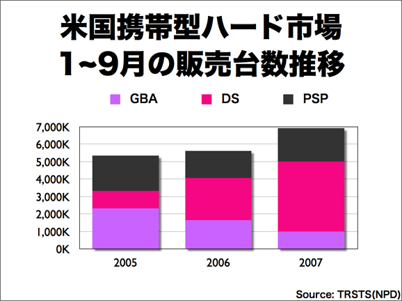 これは、アメリカ市場における2005年から2007年までの1〜9月の携帯型ハードの販売数をNPDのデータを用いて比較したものです。携帯型ハードは全体として大きな伸びを見せており、特にDSの伸びは、66%とその中でも特に大きいことがおわかりいただけると思います。