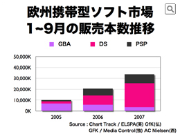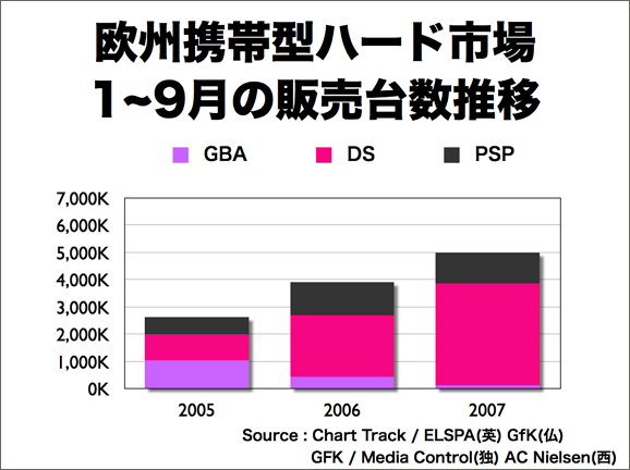 これは、2005年から2007年までの1〜9月の携帯型ハードのヨーロッパにおける販売台数を、イギリス、ドイツ、フランス、スペインの4ヶ国の各国の調査会社が発行しているデータを任天堂で集計して比較したものです。ヨーロッパ全体の市場の中で、この4ヶ国の市場規模は、75%から80%であると言われておりますので、本日は、これら4ヶ国の集計結果でヨーロッパ市場の傾向をお話ししてまいります。ヨーロッパでは、この2年で携帯型ゲームハードの販売数はほぼ2倍に伸びました。その中でDSの占める割合は特に大きくなっています。2005年の時点では、ヨーロッパではアメリカの半分以下の販売台数でしたが、その販売比率は大きく変化しつつあり、この4ヶ国のグラフがヨーロッパ市場全体の8割弱であることを考えますと、アメリカ:ヨーロッパの販売比率が1:1に近づきつつあることがわかります。