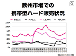 3月にWiiががくっと落ち込んでいますが、これは2月の旧正月時の影響で、中国での製造の落ち込み分の影響が出たことによるものですが、それを除いて、Wiiが季節性なくコンスタントに売れていることがわかります。アメリカでは、7月のPS3の値下げ、8月のXbox360の値下げ、9月のHALO3の発売ということによってXbox360が伸びたりしていますが、Wiiの販売数そのものは他社さんのマシンの値下げその他の影響をほとんど受けておらず、むしろ市場への供給量そのものが制約になっていたことがおわかりいただけると思います。