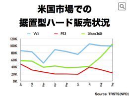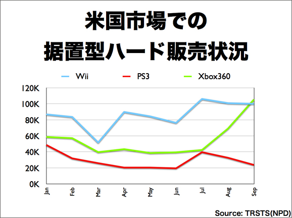 こちらは、アメリカ市場における据置型の3つのハードの販売数の比較です。
