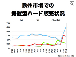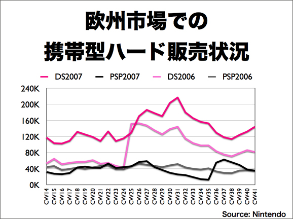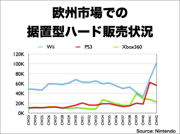 Wiiは39週と40週目に減衰が見られますが、これは、主にイギリスで品切れが起こっていたことによるもので、在庫が回復した41週目から販売ペースが急回復しています。