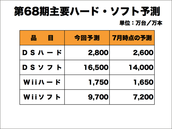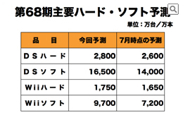 主要なハード・ソフトの予測についてですが、今期のニンテンドーDSのハードは、2,600万台から2,800万台に、ソフトは1億4,000万本から1億6,500万本に変更しました。また、Wiiは、ハードが1,650万台から1,750万台に、ソフトは7,200万本から9,700万本に予測を変更しています。