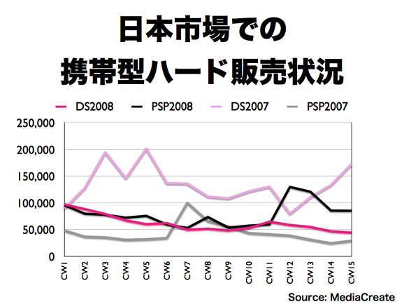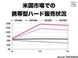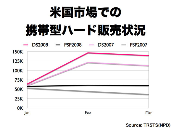 このグラフは、NPDデータによるDSとPSPの各月の販売数を元に、昨年と今年の1〜3月のアメリカ市場における1週間あたりの販売数の推移を示したものです。