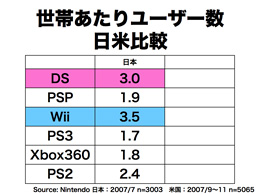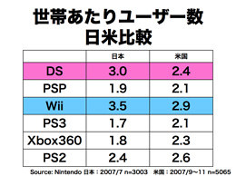 昨年秋に、日本についての調査結果はお話ししましたが、かつて、据置型ゲームで2.2〜2.8、携帯型ゲームで2.0前後だった世帯あたりユーザー数は、Wiiでは3.5、DSでは3.0と、史上最も高いものになっています。