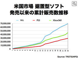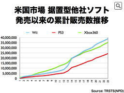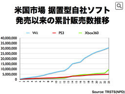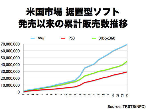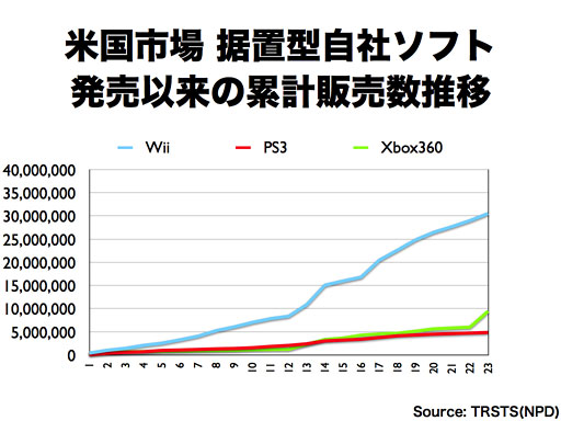 このようになります。Wiiの独自性がはっきりとおわかりいただけるグラフです。みなさまもご存知の通り、ゲームビジネスにおけるプラットフォームの普及には、いわゆる鶏と卵問題というのが存在します。すなわち、ハードの普及台数が多くならないと、ソフトメーカーさんにとって魅力的な市場にならないという事実がある一方で、魅力的なソフトが充実していないとハードは売れない、ということがあるからです。うまくいかないプラットフォームは、この鶏と卵問題を解決できずに苦しむことになります。これは私たちもゲームキューブでまさにこの問題を乗り越えることができずに、非常に厳しい経験をしてきました。私たちは、プラットフォームの発売後2年ほどの、自社発売ソフト、いわゆるファーストパーティソフトの最大の役割は、ハードの普及を促進して、ソフトメーカーさんにとって魅力ある市場の流れを早期に確立することにあると考えてきました。Wiiでは、いくつかのロングセラーのヒットソフトに恵まれるという幸運もありまして、うまく流れを作ることができたと思います。もし、ソフトのヒットがロングセラー化していなければ、一時的にマーケットが盛り上がっても、すぐに次のソフトが必要になるということになるわけですが、残念ながら任天堂や任天堂のパートナー企業さんの開発人員は無限にいるわけではありません。したがって、それほど多数のソフトをどんどん展開できるわけではありません。ですから自社ソフトを、自社タイトルを中心にした市場を確立するということにおいては、任天堂の持つ強みを多面的に活かして、ロングセラーを作るということが求められたわけですが、今回は、それが非常にうまく廻ったということだと認識しております。