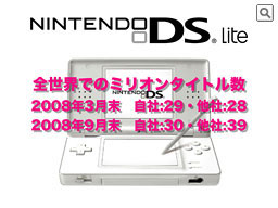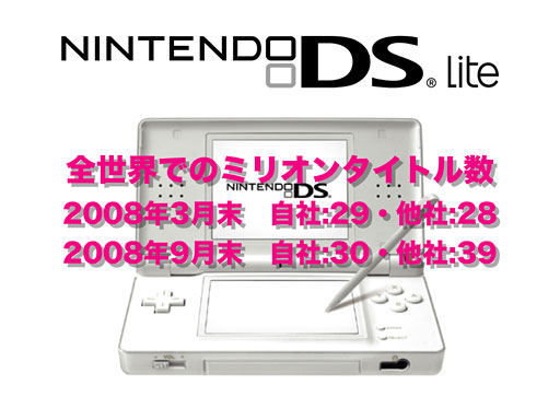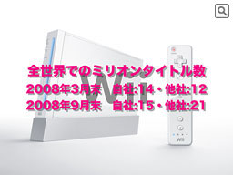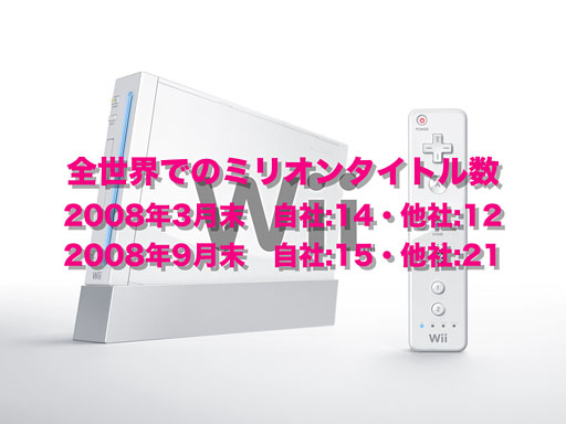 Wiiについても、全世界の出荷ベースで100万本を超えたタイトルは、今年3月末までの累計では、任天堂・ポケモンが14タイトル、ソフトメーカーさんのタイトルが12タイトルだったんですが、この9月末までの累計では、任天堂・ポケモンのタイトルが1タイトル増えて15タイトル、ソフトメーカーさんのタイトルは9タイトル増えて21タイトルと、やはりこちらも、ワールドワイドのミリオンセラーのタイトル数ではソフトメーカーさんの方が多くなりました。