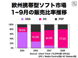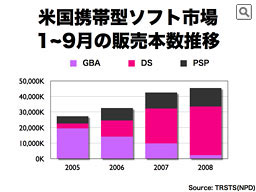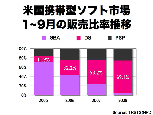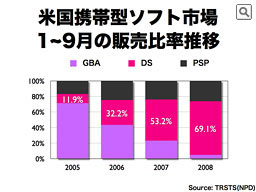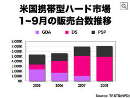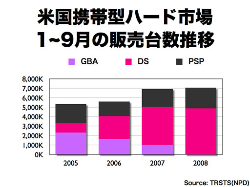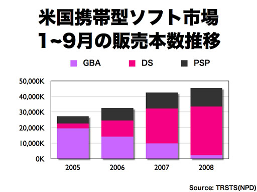 これは、アメリカ市場における2005年から2008年までのそれぞれの年の1〜9月の携帯型ハードの販売台数をNPDデータを用いて比較したものです。