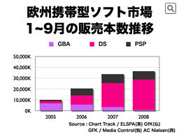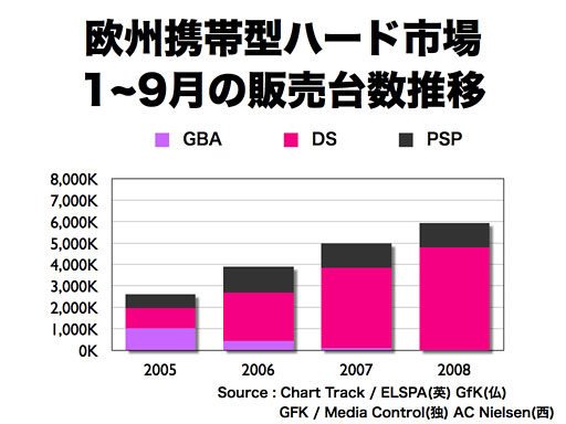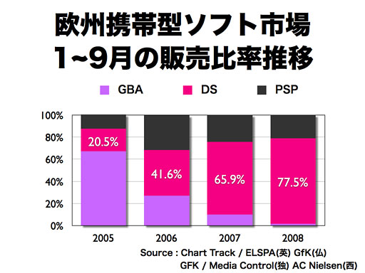 これは、2005年から2008年までの1〜9月の携帯型ハードの販売台数を、イギリス、フランス、ドイツ、スペインの4ヶ国の各国の調査会社が発行しているデータを任天堂で集計して比較しているものです。ヨーロッパ全体の市場のうち、この4ヶ国の市場規模は、75%から80%程度になります。本日は、これら4ヶ国の集計結果でヨーロッパ市場の傾向をお話ししてまいります。DSは今年も27%伸び、2005年にはアメリカの半分程度であったヨーロッパ携帯型ゲームハードの販売数は、この4ヶ国のグラフがヨーロッパ市場全体の8割弱であることを考慮すると、アメリカを追い越すまでになったことがおわかりいただけると思います。