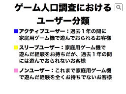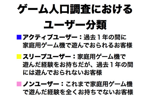 このゲーム人口調査において、任天堂は、お客様を3種類に分類しています。まず、過去1年以内に家庭用ゲーム機、これは、任天堂のゲーム機だけでなく、他社さんのゲーム機も含みますが、何かでプレイされた経験のある人を、アクティブユーザーと定義しています。このようなお客様をこれからのグラフでは青色で表します。次に、かつて家庭用ゲーム機で遊んだ経験をお持ちでも、過去1年間は遊んでおられないお客様を、スリープユーザーと定義しています。これらのお客様が増えてしまったことが、いわゆる「ゲーム離れ」現象を生み出していたと考えられます。このようなお客様をこれからのグラフでは黄色で表します。最後に、これまで家庭用ゲーム機で遊んだ経験を全くお持ちでないお客様を、ノンユーザーと定義し、ピンク色で表します。