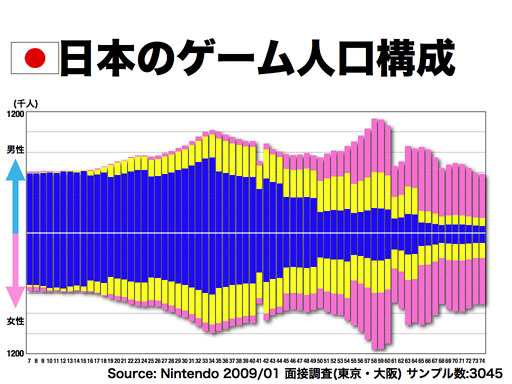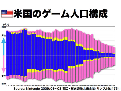 これは、今年1月の日本の調査で、日本のゲーム人口構成を表したものです。上が男性、下が女性、一番左が7歳、一番右が74歳です。当初2回の調査では、7歳から64歳で行っていたのですが、「5歳から95歳まで」というスローガンを掲げる会社が、64歳までしか調べないのでは十分ではないだろう、という判断で、2006年の5月からは、74歳までの方に調査にご協力いただいています。