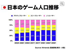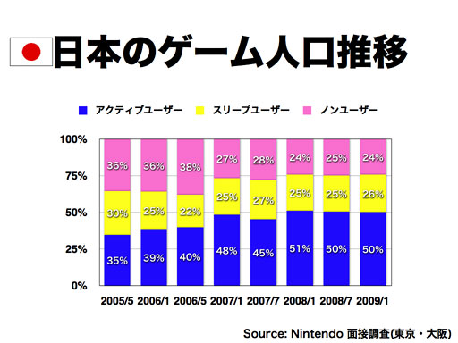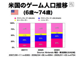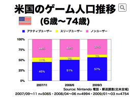 このようになります。ご覧のように、DSやWiiを楽しんでいただいているお客様の割合は、急激に拡大しており、先ほどお見せしたアメリカの市場規模の推移は、ここで示されるゲーム人口の拡大に支えられていることがはっきりと読み取れます。