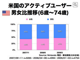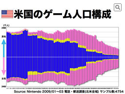 ビデオゲームはかつて、「子供さんと若い男性中心の娯楽」という認識が主流でしたが、ゲーム人口拡大の前進と共に、これは過去のものになりつつあります。ちなみに、DSやWiiのお客様だけを取り出すと、アメリカでも女性比率は49%となり、ほぼ男女比が1:1という状況に到達しています。