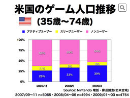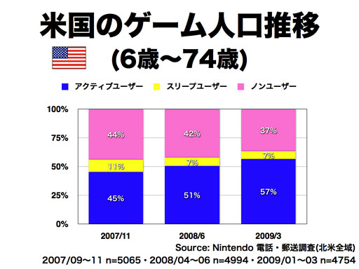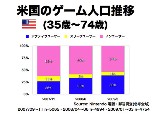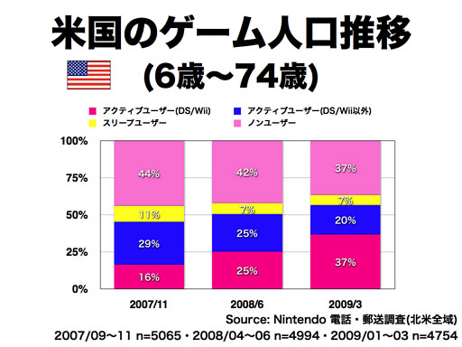 アメリカは調査開始が遅かったことや、もともと、ゲーム離れ現象が表面化していなかったことなどから、最初からゲーム人口比率が高かったのですが、まず最初にスリープユーザーがアクティブユーザーに戻る流れがあり、そして、最終的にノンユーザーがアクティブユーザーに変わるという、日本で起きたのと同じような推移がこの1年半ほどの間に起こっています。ゲーム人口は約3,000万人増えて、ゲーム人口比率は短期間で急激に高まっていることがおわかりいただけることと思います。この青色のアクティブユーザーの部分を、DSやWiiを遊ばれているお客様と、そうでない部分に分離すると、