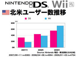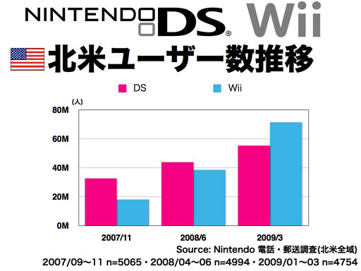 そしてこの3回の調査の間に、ニンテンドーDSやWiiのお客様の数が劇的に拡大しました。日本では、ニンテンドーDSの普及の過程でゲーム人口が大きく拡大しましたが、アメリカではWiiのお客様の数が短期間で一気にDSのお客様の数を追い抜き、このWiiの普及でゲーム人口が大きく拡大していると言えます。