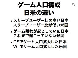 そして、もうひとつ、ゲーム人口の構成が日米では大きく異なるということがあります。これは、先ほどご紹介した、任天堂のゲーム人口調査の分析でお話しします。