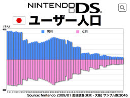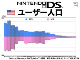 これは、アメリカの最新の調査におけるDSのお客様の構成です。日本と比べると、大人層の厚みがまだ十分に拡大しておらず、そこに市場拡大のチャンスがあると考えられます。先ほどお話ししたとおり、対人口比では、DSの普及率は日本のまだ半分なのですから、まだまだ拡大の余地があると私たちは考えています。