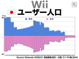 そして、これが日本最新の調査におけるWiiのお客様の構成です。アメリカと比較すると、子供さんとその親御さんの年齢層においてお客様が多い、いわゆる「ふたこぶラクダ型」のプロポーションになっています。DSでも、普及の初期には、このようなプロポーションだったのですが、普及が進むにしたがってバランスが変わり、先ほどお目にかけたように、幅広い年齢層のお客様にバランス良く楽しんでいただけるように変わっていきました。私たちは、日本でもアメリカと同じようなお客様のプロポーションを目指して普及を進めてきたのですが、日本では、必ずしもそれが期待通りに進みませんでした。
