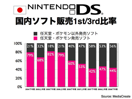 これは、以前にもご紹介したことがありますが、DS発売以来、任天堂やポケモンのソフトが市場全体に占める割合がどのように推移したかを示すグラフです。最新のデータで更新してあります。このグラフでハードの発売から約2年は、任天堂の比率が非常に高かったことがおわかりいただけると思います。以前にもお話ししたことがありますが、私たちは、自社ソフトいわゆるファーストパーティソフトの使命は、「ハードを購入してでも遊びたい」と感じていただけるだけの魅力あるソフトをプラットフォーム普及の序盤に次々と投入し、ハードが順調に普及していく流れを作ることにあると考えてきましたので、ハード発売から2年ほどは、特に重点的にソフトを展開するようにしています。この時期、自社ソフトの市場占有率は高まってしまう副作用もありますが、WiiやDSのような全く新しい概念のプラットフォームでは、自分たちが市場を切りひらく必要があると考えて、そのように進めてきました。そして、ハードが一定数普及した後は、ソフトメーカーさんから多彩なソフトが登場するようになり、それに伴って、お客様の年齢構成バランスも、より幅広くバランスが良くなっていくという流れが、DSでは順調に機能したわけです。