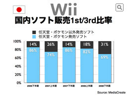 しかし、日本におけるWiiでは、DSで機能した流れ通りに推移しているとは言えません。発売から2年を経過した前期の下半期も、ソフトメーカーさんのソフトの割合を大きく高めることはできませんでした。DSとWiiでは、ソフトメーカーさんがソフトを開発されるのに要する時間の長さが異なることや、Wiiという全く新しい思想のハードでのソフトづくりに苦労されているソフトメーカーさんがおられるということも耳にしています。このようにソフトメーカーさんのソフトによる市場形成がまだ機能していない日本の市場の環境の中で、今年の前半に新ソフトによる新たな提案することがタイムリーにできなかったことが、現在の日本のWii市場の勢いが失われた要因になっていると分析しています。日本では、この夏に『モンスターハンター3(トライ)』という大型ソフトが登場しますし、その後も有力ソフトがいくつか登場してきますので、これを重要な局面と捉えて、Wiiにおけるソフトメーカーさんのソフトの存在感を高めることにチャレンジしていきます。