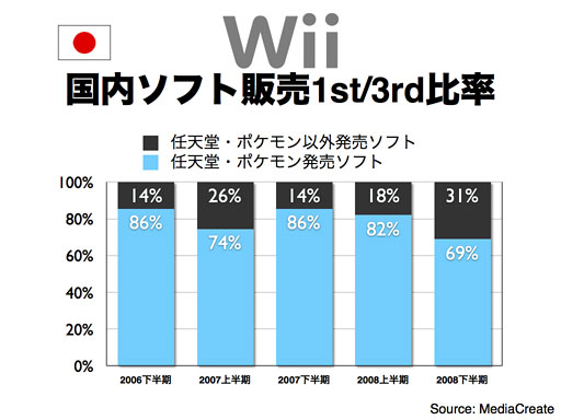 日本では、「任天堂ハードでは、売れるのは任天堂のソフトばかりで、ソフトメーカーさんのソフトが売れない」というご指摘をよくいただいていました。DSの普及の初期にもよくこのようなご指摘がありましたが、それはDSの普及と共に変わりました。しかしながら、Wiiについては、今でも、そのようなご指摘を引き続いていただいています。