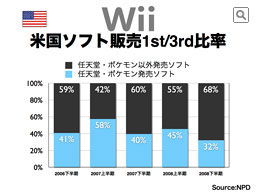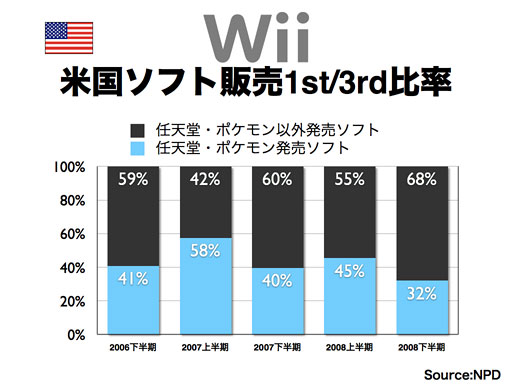アメリカでは、海外のソフトメーカーさんが、Wii発売直後から積極的にWiiのソフトを展開されており、ミリオンセラーのソフトも複数登場しています。2008年暦年において、サードパーティソフトが最も売れたプラットフォームはWiiであった、ということも、NPDのデータで明らかになっています。
