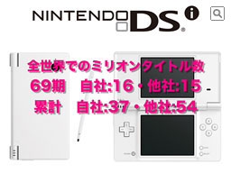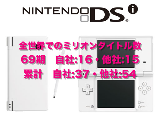 全世界の出荷ベースで100万本を超えたDSタイトルは、68期で任天堂・ポケモンのタイトルが15タイトル、ソフトメーカーさんのタイトルが11タイトルでしたが、69期には、任天堂・ポケモンのタイトルが16タイトル、ソフトメーカーさんのタイトルが15タイトルとなりました。前期までの累計では、任天堂・ポケモンのタイトルが29タイトル、ソフトメーカーさんのタイトルが28タイトルでしたが、最新の累計では、任天堂・ポケモンのタイトルが37タイトル、ソフトメーカーさんのタイトルが54タイトルと、ミリオンセラーのタイトル数ではソフトメーカーさんのソフトの方が、かなり多くなりました。