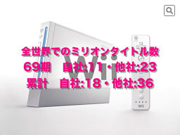 Wiiにおいては、その増え方のペースはさらに急激です。全世界の出荷ベースで100万本を超えたタイトルは、68期で任天堂・ポケモンのタイトルが12タイトル、ソフトメーカーさんのタイトルが8タイトルでしたが、69期で任天堂・ポケモンのタイトルが11タイトル、ソフトメーカーさんのタイトルが23タイトルと、こちらも単年度でソフトメーカーさんのタイトルの方が多くなりました。前年までの累計では、任天堂・ポケモンのタイトルが14タイトル、ソフトメーカーさんのタイトルが12タイトルでしたが、最新の累計では、任天堂・ポケモンのタイトルが18タイトル、ソフトメーカーさんのタイトルが36タイトルと、ミリオンセラーのタイトル数ではソフトメーカーさんのソフトの方が、自社タイトルの倍に到達しています。