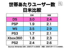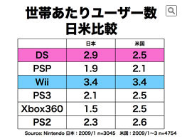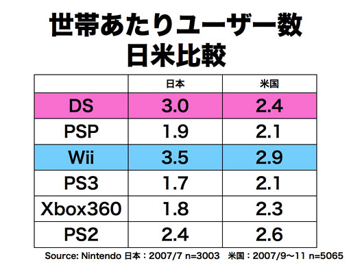このようになりました。日本では、世帯あたりユーザー数は、Wiiでは3.4、DSでは2.9と、他のプラットフォームには見られない高い水準を維持しています。任天堂が、「Wiiの間」のような新しいサービスに取り組むのも、Wiiがこのような他のプラットフォームには見られないユニークな特性を有しているからでもあります。アメリカでも、Wiiの世帯あたりユーザー数は日本と同水準の3.4に増え、明らかに他のプラットフォームとは異なる水準になっています。Wiiについては、本当の意味で、アメリカにおいても家族全員にとってゲームが関係のあるものになったと言えそうです。これが、Wiiがゲーム人口を拡大しながら、ソフトビジネスの急激な拡大を生み出している構造になっています。