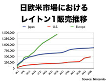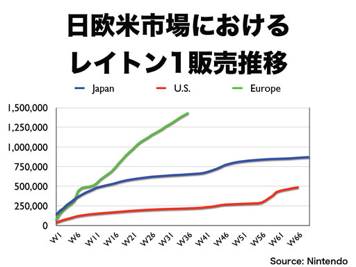 岩田: まず、DSのビジネス全体で言いますと、台数の比較だけを見ますとビジネスが縮小している様に見えると思いますが、現実にDSとDSiの価格差を考えますと、ビジネスの総規模という意味では、前年と大きく違いません。また、昨年の場合は例えば、6月にヨーロッパでDS Liteの多色展開を行いまして、そのときに流通さんも非常に積極的に仕入れをされましたので、今年はそういうファクターがなかったという面もあります。ヨーロッパはあまり(売上)数字が普段出ないので、アナリストの皆様は数字を見たいとよくお聞きしていますのでデータを持ってきました。 去年、この後ろの方、ぐっと盛りあがっているところがDS Liteの新色効果です。今年はそのような特別なことをしていませんので、その分の上乗せが出せなかったというところです。ちなみに大きく飛び上がっているところは、ご想像の通りDSiを発売した瞬間です。DSiの発売前には、去年の水準を少し下回っていて、DSiで大きく販売が伸びましたので、6月くらいまでは大体去年と総量としては同じぐらい売っていたという感じです。今後の展開という意味でいいますと、ヨーロッパでは、ひとつ非常に面白い売れ方をしているソフトがありますので、そのご紹介をしておこうと思います。 『レイトン教授』のソフトですが、パッケージデザインがまったく違うので驚かれると思いますが、ヨーロッパだけこういう箱で売りました。これは日本ではレベルファイブさんというソフトメーカーさんが売られたソフトを、アメリカやヨーロッパでは任天堂が販売をさせていただいているのですが、このソフトは『脳トレ』でDSを始めた方の次の1本としてポテンシャルがあるのではないかということで、ではどうすれば次の1本に選んでもらえるかということをいろいろ議論しまして、こういうパッケージで売り出したのです。 私はこのグラフを見て驚いたのですが、これは『レイトン教授』1作目の日本とアメリカとヨーロッパの売れ方の違いです。発売からのカーブですが、日本でも最終的に累計で90万本強、売れています。実際には、(発売から2年が経過していますので)現状の日本の青い線はさらに右まであり、100万本にかなり近いところにどんどん近づいていくのですが、グラフを見やすくするために途中で切っています。ご覧のように、ヨーロッパだけ例外的な売れ方をしています。多分、パッケージを変えてお客様にアピールしたことで『脳トレ』の次のソフトとして買っていただけたのではないかと思います。実際に調べますと、女性のお客様が多く、『脳トレ』でDSを始めた方が多い、ということも分かっています。実はこれがうまくいきかけた頃に、「もし、(このソフトを)うまく立ち上げることができたら、(シリーズで)3部作だから、長い間DSマーケットのために「次の1本」が提供できて、とても大きなメリットがあるのではないか」ということで、しっかり投資をしたのです。 その結果、今、(ヨーロッパでのこれまでの累計販売数は)140万本ぐらいですけど、年内に十分200万本がねらえる状況です。(週間販売数)がまったく落ちていませんので、このまま売れていく可能性が大いにあると思っています。秋にはこれの『II』が出ます。こんな箱になります。これをヨーロッパで秋に出すことで「次の1本」としてのアピールをしたいと思います。 ちなみにアメリカで、右の端の方で赤い所ですが、突然上がっている所があります。アメリカはヨーロッパより早く発売していたのです。日本と同じパッケージで売りましたので、(西洋のお客様に対しては)アピールが少々うまくいってなかったのかもしれません。現に、最初に『レイトン教授』に火が着いたのはイギリスでしたから、こういうポテンシャルがあるならがんばって売ってみようということで、宣伝を作り替えて再度マーケティングをやり直しました。そのときの結果が右端のところです。ですから、もともと最初に開発されたときにどの程度海外展開のことを検討されて作られたのかは、私には知る由もありませんが、少なくとも日本で多くのお客様に受け入れられたように、海外でもアピールの仕方次第で、そのポテンシャルを販売につなげることは可能だという様に思っています。こういうことがいくつできるかが鍵だと思うのです。 確かに、『マリオカート』だとか『ゼルダ』だとか『マリオ』の本編のアクションゲームだとかというものが任天堂にとって非常に大事なソフトであり、それがあるから任天堂のゲーム機は安心して買っていただけるということがあるのは事実ですが、同時に、予想もしないものが売れるというのは非常に重要だと思っています。去年の例で例えば、『リズム天国』が発売前に、170万本以上日本で売れることになると予想していた業界関係者は1人もいなかったと思います。もっと前で言えば、『Nintendogs』や『脳トレ』がこれ程売れるとは誰も予想していなかったという