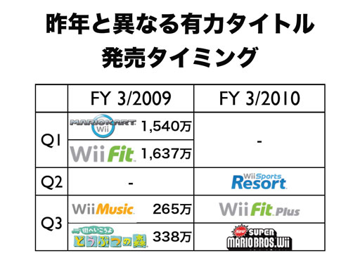 取締役社長 岩田 聡: こちらをご覧ください。昨年4-6月期に、『マリオカートWii』と『Wii Fit』というソフトを出し、年間でそれぞれ、1,540万本、1,637万本売れました。もちろん、これは上半期だけに売れたわけではなくて通期でこれだけ売れたということです。一方で今年は、4-6月期には、こういう大きなインパクトのある、全世界で数ミリオン以上売れるようなソフトを任天堂は発売できませんでした。また、ご指摘の通り、『Wii Sports Resort』は、当初はもう少し早い時期の投入をイメージして開発していましたが、1つは「Wiiモーションプラス」を十分な数量作ってから出したいということ、それからもうひと粘りすればグッと面白くなりそうだという手応えもあったことなどから、発売が少しずれ込み、日本での発売は6月末、アメリカでの発売、ヨーロッパでの発売は、先週末、7月の末になりました。そのため、今年の有力ソフトというのは、第2四半期に『Wii Sports Resort』、それから第3四半期に『Wii Fit Plus』と『NewスーパーマリオブラザーズWii』ということになります。 すでにこれら3つのソフトについては、E3で実演をさせていただきました。触っていただいた方からは非常に高く評価していただきましたし、流通さんからも、「今年の年末のキープレーヤーはやはり任天堂であろう」というふうにご評価いただきましたので、これら3つそれぞれが、世界全体で見れば、通期で1,000万本以上は十分にねらえるポテンシャルがあるソフトだと思っています。 もし昨年も10-12月の期間にそのようなソフトが出せていたのであれば、今年、今から(通期のソフト)販売を(昨年の水準に追いつくように)挽回することは相当きついんじゃないかということが言えるわけですが、昨年、残念ながら『Wii Music』や『街へいこうよ どうぶつの森』は、私たちの期待通りにはならず、それぞれ265万本、338万本にとどまりました。これらのソフトがロングセラー化していれば今年の前半のソフト不足の影響はもっと小さかったと思います。 ところがこれらのソフトは比較的短期間で販売数が落ち込んでしまいまして、もっと前に発売した『マリオカートWii』や『Wii Fit』の方が、ハードを牽引しながら売れ続けるという状況で、昨年度について言えば、年度初めに出した2つの有力ソフトがずっと市場を牽引してWiiハードも売れていきました。ただ、どんなソフトも発売から1年を超えてきますと、やはり最初ほどのインパクトは持ち得なくなります。よって、この第1四半期に、もし「Wii Sports Resort」がもう少し早く出せていたらという点と、もし昨年の年末に出した商品がロングセラー化できていたらという点の2つの要因があり、特にWiiの落ち込みというのはそういう要因が複数重なって起きてしまったのではないかと私たちは考えています。やはり、クリスマスだけではなく、年中ビジネスが活況を呈するには、常に定期的に新しいものを出さねばならないわけですが、一方でソフトの開発というのは事前にすべてが分かるわけではないのです。驚きや面白さについて仕様書を書き最初の基本デザインをした時点で100パーセント見通せる人間はいないわけです。ある程度作って初めて分かる部分があるので、完成が予定通りにならないことが起こっているわけですが、私たちも今回はそういうミスを犯してしまったと思います。 一方で、『Wii Fit Plus』や『NewスーパーマリオブラザーズWii』が、予定通り出せないという心配は、今まったくしていません。今年は昨年と比べますとどうしても有力タイトルが下期偏重、これは任天堂だけではなくて、他社さんにも見られる現象で、そのため、アメリカのNPDデータでも、3、4、5、6月が前年割れという報道がされていますけれども、これは「単純に景気の影響を受けた」というよりは、昨年この時期には私たちにも『マリオカートWii』や『Wii Fit』がありましたし、他社さんでは『グランドセフトオート4』がありましたし、そういうような全世界で1,000万本級のヒットタイトルがあったかなかったか、ということの違いが大きいと思っています。逆に、今年の後半には全世界で1,000万本級のタイトルがあるわけですから、下期に今まで以上に大きなビジネスができるんじゃないかというのが私たちの見立てで、それが期待できると思っています。確かに当第1四半期の業績は私たちが想定した範囲のかなり下限に近い、決してよくない数字であると認識していますけれども、通期では挽回可能であろうということで業績を据え置くという判断をしました。 |