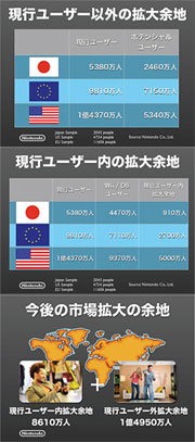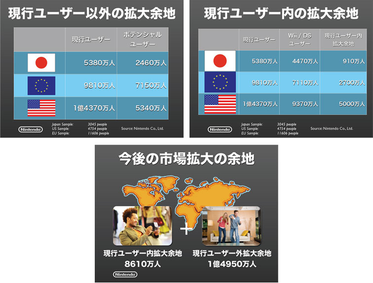 岩田: 過去にも経営方針説明会や決算説明会等でお話しさせていただく際に繰り返し申しあげてきましたが、「過去に何年サイクルであったから今後も何年サイクルで考えるべきだ」というふうには私はまったく考えていません。ただ、一方で、今言われたように、スーパーファミコンからニンテンドウ64は(海外では)5年、日本だけでいうと6年、ニンテンドウ64からゲームキューブが5年、ゲームキューブからWiiはまた5年ということがありましたから、5年サイクルというものが、どこかで信じられているというのも事実かと思います。過去には、ちょうど5年くらいすると、ビデオゲームをしていただけるお客様にある程度製品が行き渡ってしまい市場が飽和するという点と、5年すると半導体の技術が非常に進むため、同じ値段で作れる半導体で表現できるグラフィックスの質が劇的に変わり、そしてグラフィックスの質を高めるとお客様が明らかに魅力を感じられるという循環が回っておりましたので、5年サイクルというのが続いたわけです。 本世代の大きな特徴は2つありまして、1つはグラフィックスの向上による刺激にお客様が以前ほど価値を感じられなくなり、一般のお客様には(グラフィックス向上による)差が分かりにくくなってきているという点です。もう1つが、任天堂がお客様の層を広げる取り組みをし、結果的に今までのお客様よりももっとビデオゲームに関与や関心が薄くて、能動的に情報は取りに来られないけれども、面白いものがあったら、そういうものに支出をされるたくさんの方々が、新しくゲームユーザーになっていただいたので、お客様の層が変わり、お客様の人口が増えたという点です。お客様の人口が増えたということは、1年あたりに売れる数量が増えたり、あるいは延べで売れる数量(ハード・ソフトの累計普及数)が変わったりするわけで、そういうことが起こっているのがDSでありWiiのマーケットだと思っています。その意味では私たちは5年周期にとらわれずに考えようと思っています。 今の話に関連しますが、このようにスローダウンが起こってくると「ゲーム人口拡大もそろそろ限界ではないでしょうか?」ということを多くの方が心配されるようになると思います。 このスライドは、任天堂が日本、アメリカ、ヨーロッパ(主要な6ヵ国のみ)において、一般消費者の方々のゲーム関与に関する調査を基に推定したお客様の数です。世の中には、今ゲームを遊んでおられる方、「将来ゲームを遊んでもいい」と思っておられる方、そして「金輪際ゲームなんかゴメンだ」と思っておられる方、昔はそう答えていても今では「ゲームをやってもいい」とか、「今ゲームで遊んでいます」と言ってくださるお客様もおられるので、これは固定的なものではなくて、定点調査をしていくと、変化が分かって非常に面白いのですが、これは今年の春時点での世界中のデータです。現在ゲームを遊んでおられる方(現行ユーザー)は、日本に5,380万人、ヨーロッパ主要6ヵ国に9,810万人、アメリカに1億4,370万人いらっしゃるわけです。その他に、「私はゲームを遊んでもよい」と思っている、「ゲームに興味があります」と答えている方、すなわちアクティブユーザーになる準備ができている方々(ポテンシャルユーザー)が日本には2,460万人、ヨーロッパには7,150万人、アメリカに5,340万人いらっしゃいます。特にヨーロッパは、現状の市場の大きさに対して拡大の余地が大きいです。 また、現在のユーザーさんの中で、WiiやDSを使っている人とそうではない人がおられます。日本では、アクティブなお客様、現行のお客様の中でWiiまたはDSを触っておられるお客様の割合は世界一高くて8割以上の方にWiiやDSを触っていただいていますが、それでも「他の機械ではゲームはするけど任天堂の機械ではしてない」という方が結構おられます。これは、特に比率で言いますとアメリカに拡大の余地が大きくて、1億4,370万人のうちWiiやDSのお客様が9,370万人で、新たに5000万人が拡大の余地として残っています。その人たちにWiiやDSを買っていただけるように、私たちは努力したいと思っています。今調査対象の国々で現在のゲームを遊んでおられる方は2億9,560万人で、そのうち2億950万人は、WiiやDSを遊んでおられるのですが、私たちは、実は社内で、「任天堂のお客様を世界で2億人にしよう」と密かなマイルストーンとして置いていたのですが、今年の春の時点で達成できたことが分かったという事実があります。さらに現行のお客様以外の拡大余地が1億4,950万人と、今のお客様の中でまだWiiやDSを触っておられない方が8,610万人、これらの国々にいらっしゃるので、実は今のWiiやDSのユーザー数というのは、理屈の上では、今の倍にさえなりうるわけです。ですから、「(今はもう)サイクルの終わりで、もうすぐ次の機械を出さなきゃいけない」というようにはぜんぜん思っていませんし、そういう意味でも、何年サイクルという