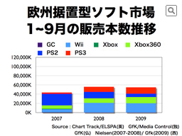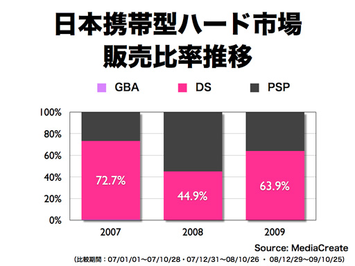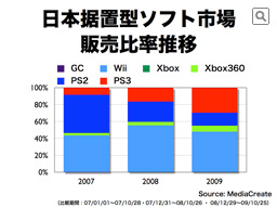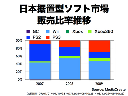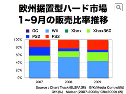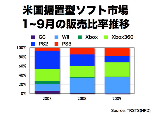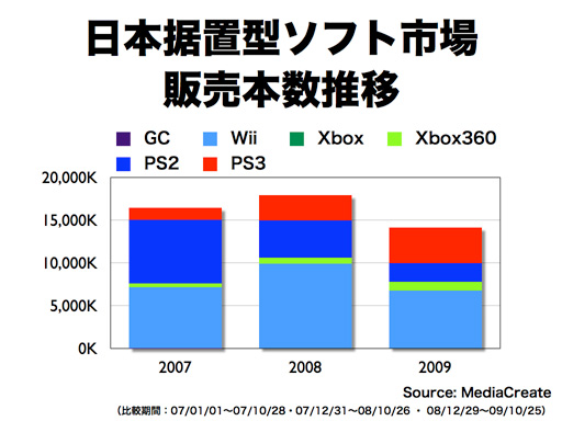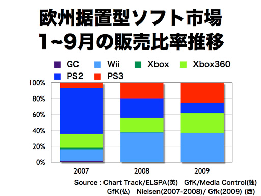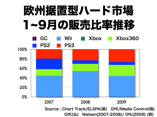 昨年同時期にアメリカ以上の伸びを見せてシェアが5割を超えていたWiiですが、今年は2007年の水準に戻ってしまいました。ヨーロッパの価格改定は10月に入ってからでしたので、まだその効果はこのデータには反映されていませんが、アメリカと同様に年末商戦で何とか挽回を図っていきたいと考えています。