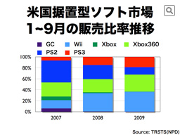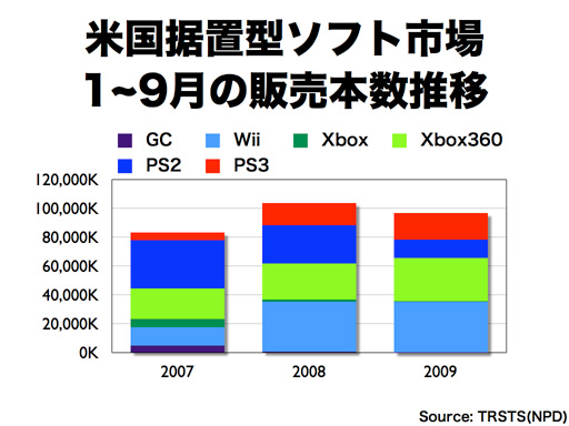 先ほど、Wiiソフトに対して日本の市場でお話しした要因はアメリカにも当てはまり、日本と比較して据置型ソフト市場の非常に大きなアメリカにおいても、Wiiが前年に対して若干しか増やせていないことや、ソニーさんのPS2のソフト販売数が前年に比べて大幅に減ったことなどの影響があり、Xbox360やPS3は若干伸びたものの、結果として、ソフト販売本数全体では前年を下回ってしまいました。