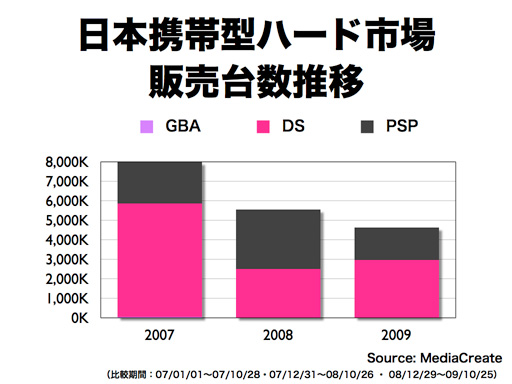 これは、日本市場における2007年から2009年までの1月から直近週までの携帯型ハードの販売台数をメディアクリエイトさんのデータを用いて比較したものです。 日本市場は、携帯型ゲーム市場の割合が大きく、携帯型のハード・ソフトについては、日本市場もアメリカやヨーロッパと同じスケールで見た方が市場規模のイメージがわかりやすいので、スケールを揃えてあります。