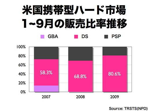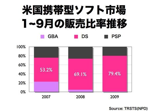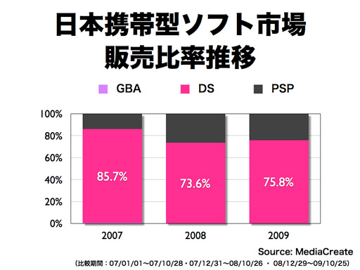 今年6月までは前年実績を割り込んでいましたが、ドラゴンクエストIX、ポケットモンスター ハートゴールド・ソウルシルバー、トモダチコレクションなど、複数のヒットソフトが次々と登場したことで、市場の勢いが出てきて、昨年を超えるペースで今は推移しています。直近週までの集計では昨年の同時期に対して約7%増という推移です。