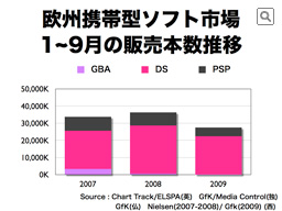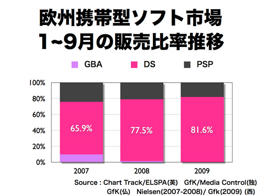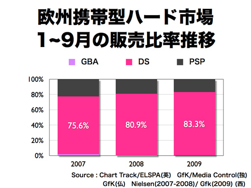 アメリカと異なり、DSハードの販売台数は、昨年に対して約17%の減少となっています。アメリカに比べてDSの普及が速く進んだヨーロッパですが、今年さらに市場規模を成長させることはうまくいきませんでした。