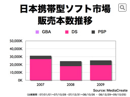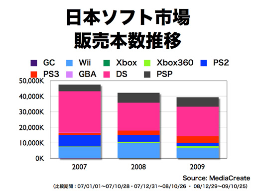 これは、日本のソフト市場における販売本数の推移です。DSソフトの販売増はあったものの、Wiiソフトの減少などで市場全体の販売本数は縮小しています。