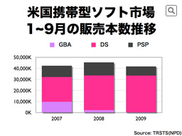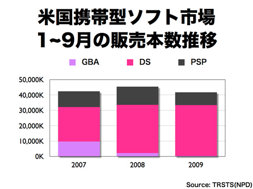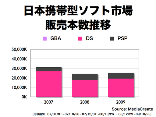 これは、日本市場における携帯型のソフトの販売本数の推移を3年間同時期で比較したものです。